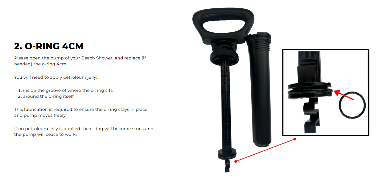 At the bottom of the pump handle locate the 4cm O-ring (arrow pointing to it on picture below) and assess if it has sufficient lubrication on it, if not please apply petroleum jelly around the O-ring.