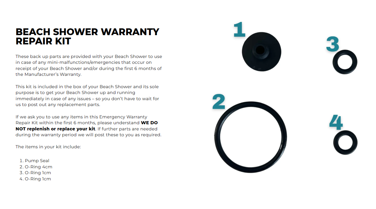 Please be assured the broken bag won’t affect the functionality of the Beach Shower. The parts that should be included in the bag are the following 4 pieces: